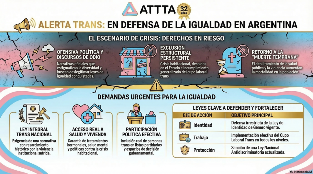 Argentina asiste hoy al resquebrajamiento de su propia identidad como vanguardia de los derechos humanos. Lo que durante más de una década fue un «faro de igualdad» para el mundo —un territorio donde la dignidad trans alcanzó estatus de ley— se encuentra actualmente bajo un asedio institucional sin precedentes. Este 8 de marzo de 2026, la Asociación de Travestis, Transexuales y Transgéneros de Argentina (ATTTA), una organización con 32 años de historia y militancia, lanzó un «estado de alerta» que denuncia no solo la crisis económica, sino un desmantelamiento sistemático de los acuerdos democráticos más básicos.